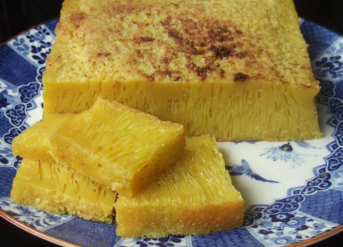 2. 椰糖黃金糕: 用 50-70 克的椰糖(Gula Melaka / Palm Sugar)切碎取代部分細砂糖(先用少量溫水溶解),增添焦糖香氣和更深的琥珀色澤,風味更醇厚。