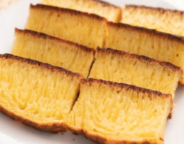 3. 鹹蛋黃黃金糕: 表面撒上烤熟壓碎的鹹蛋黃碎,鹹甜交織,罪惡但超滿足!(適合當下午茶亮點)🧂