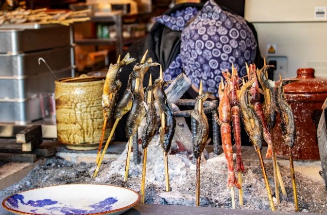 海鮮漬物屋賣醃漬小菜(章魚、蛤蜊),鹹香下飯(豐洲市場獨家醬料)。我買了辣味章魚(配啤酒絕配),但口味偏鹹(喝水補救)。